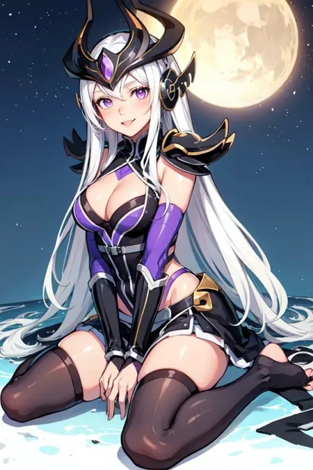 기본 시작 시 다음 태그를 사용하세요: pikkysyndra, 1girl, white hair, long hair, very long hair, purple eyes, breasts, large breasts, helmet, headwear, headpiece, gloves, cleavage, fingerless gloves, shoulder armor, pauldrons, forehead protector, black gloves, elbow gloves, armor