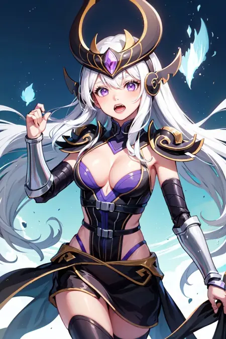 基础起始标签:pikkysyndra, 1girl, 白发, 长发, 极长发, 紫色眼睛, 乳房, 大乳房, 头盔, 头饰, 头饰, 手套, 暴露胸部, 无指手套, 肩甲, 护肩, 额护具, 黑色手套, 肘部手套, 甲胄