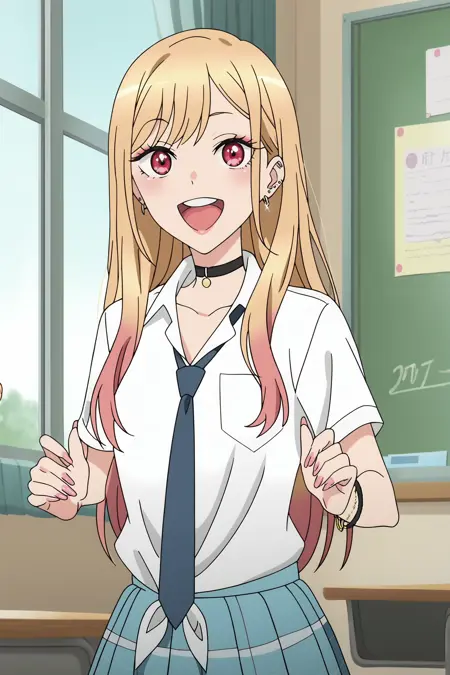 标准关键词:Marin Kitagawa, 1girl, 金发, 长发, 多色发, 红眼 | 粉色指甲, 指甲油, 指甲, 珠宝, 耳环, 耳洞, 项链, 项圈, 杠铃穿孔, 手镯