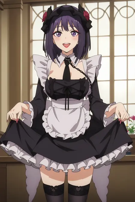 Shizuku Kuroe, cosplay, leash, wig, purple eyes, solo, purple hair, thighhighs, gothic lolita, lolita fashion, apron, frills, black thighhighs, dress, indoors, wide sleeves, chain leash, makeup, black dress, lipstick, nail polish, necktie, detached collar, hair ornament, breasts, flower, frilled dress