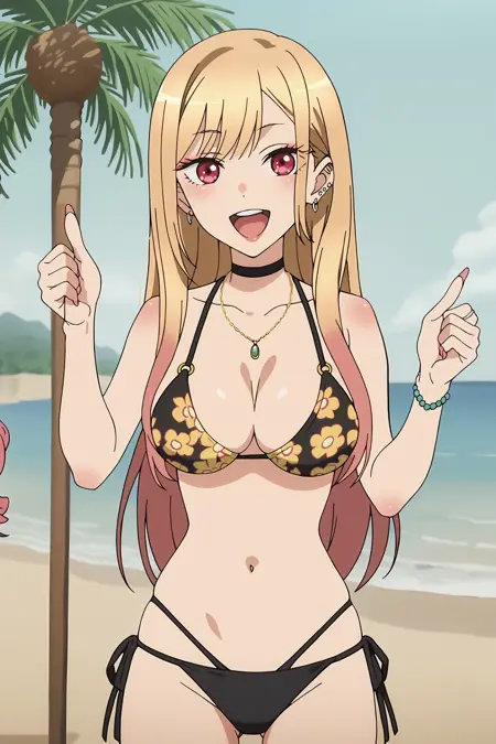 Standard keywords: Marin Kitagawa, 1girl, blonde hair, long hair, multicolored hair, red eyes | pink nails, nail polish, fingernails, jewelry, earrings, ear piercing, necklace, choker, barbell piercing, bracelet