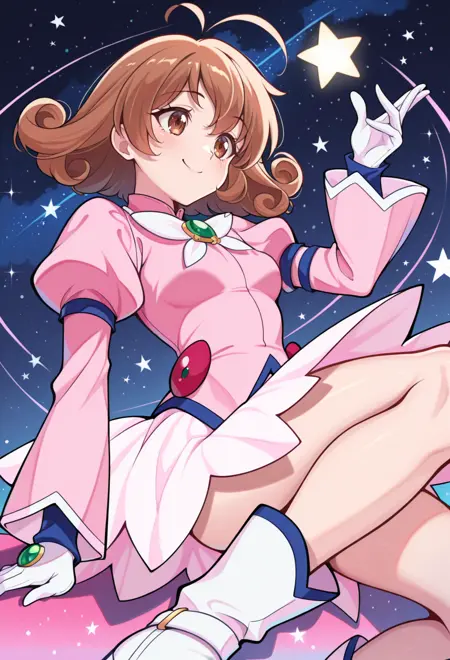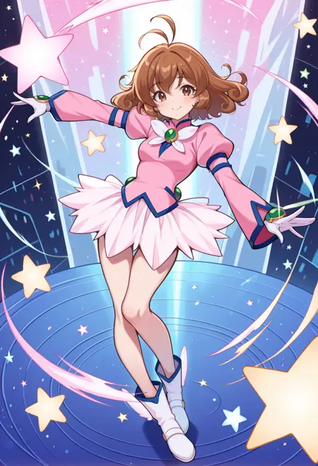 마법소녀, 브로치, 분홍색 셔츠, 줄리엣 소매, 긴 소매, 볼륨감 있는 소매, 흰 장갑, 흰 치마, 다리 노출, 부츠, 흰 신발, 미소, 별,