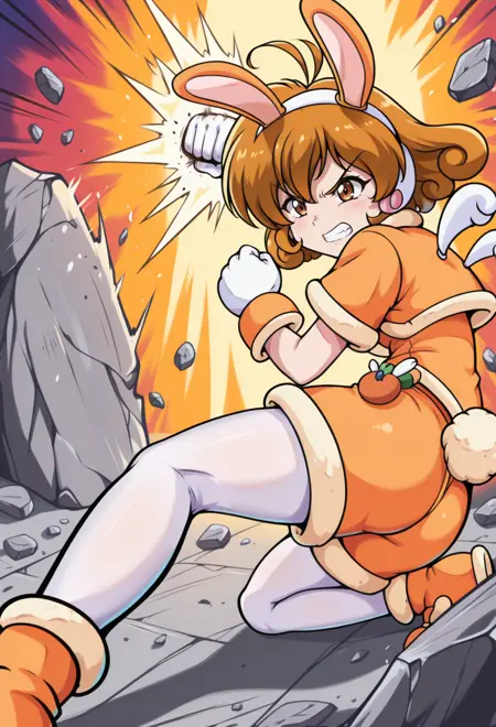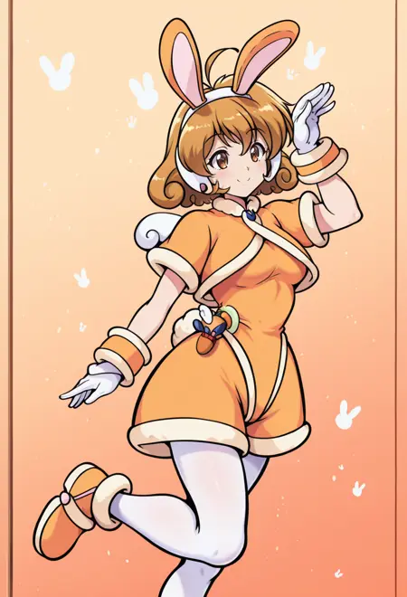 가짜 동물 귀, 토끼 귀, 흰 머리띠, 짧은 소매, 흰 장갑, 반바지, 토끼 꼬리, 흰 팬티스타킹, 주황색 신발, 날개,