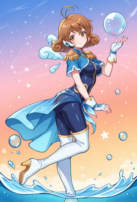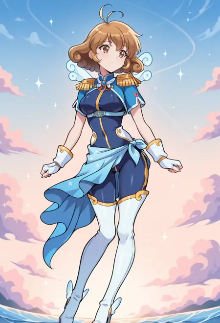 에기ulet, 파란 바디수트, 어깨장식, 손가락 없는 장갑, 짧은 소매, 흰 장갑, 사롱, 흰 신발, 허벅지 부츠, 무릎 부츠, 하이힐 부츠, 날개,