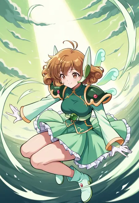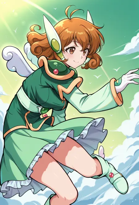 머리 장식, 녹색 셔츠, 어깨 갑옷, 긴 소매, 흰 장갑, 녹색 치마, 프릴, 녹색 신발, 녹색 부츠, 날개,