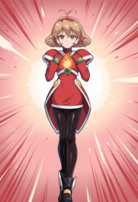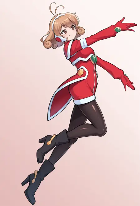 머리띠, 바디수트, 빨간 장갑, 검은 팬티스타킹, 검은 신발, 부츠, 하이힐,