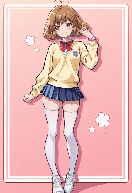 교복, 빨간 리본넥타이, 긴 소매, 노란 스웨터, 셔츠, 파란 치마, 미니 스커트, 주름 치마, 흰색 허벅지 양말, 제타이 료우키, 신발, 분홍색 손목시계,