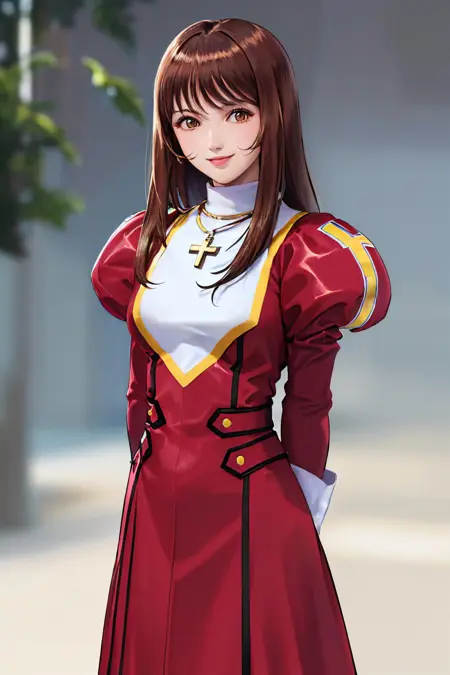 기본 복장: 빨간 드레스, 십자가, 긴 소매, 줄리엣 소매, 보석, 십자가 목걸이