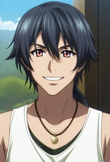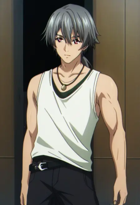 Ki Juranbarada, black-gray hair, ponytail, red eyes, necklace, white tank top, black baggy pants, asymmetrical belt