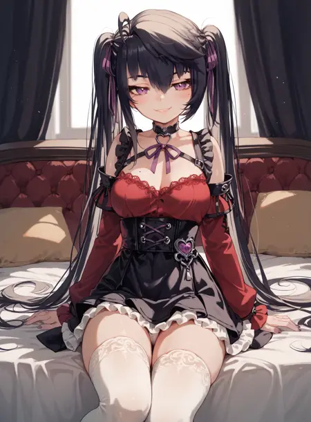 태그: _1girl, 보라색 눈, 트윈테일, 검은 머리, 보라색 리본, 머리 리본, 이톤 헤어.