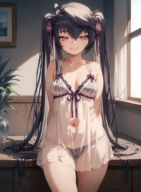 태그: 1girl, Priite Hari, 앞머리, 검은 머리, 긴 머리, 보라색 눈, 트윈테일, 눈 사이 머리카락, 보라색 리본, 머리 리본, 리본.
