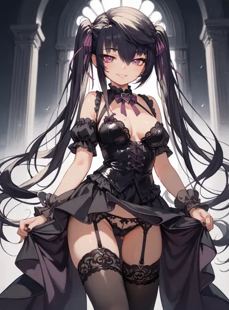 标签:_1girl,紫色眼睛,双马尾,黑发,紫色丝带,发饰丝带,双色发。