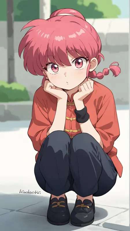 Example prompt : "ranma_chan, an anime girl, 1girl, solo, breasts, looking at viewer, blush, bangs, simple background, red eyes, white background, cleavage, sitting, braid, red hair, barefoot, pants, feet, single braid, toes, chinese clothes, braided ponytail, indian style, tangzhuang,"