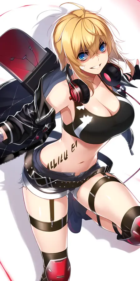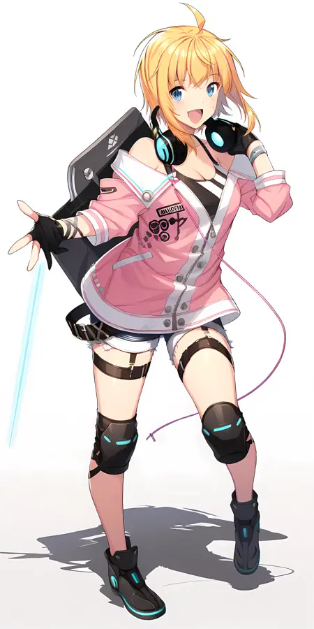 Amy Strickland의 활성화 태그는 "amy_strickland, 1girl, solo, blue eyes, blonde hair, shorts, headphones, gloves, short shorts, pink jacket, fingerless gloves, ahoge, black gloves, headphones around neck, knee pads, off shoulder,"입니다.