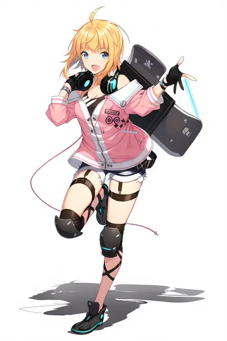 エイミー・ストリックランドのアクティベーションタグは "amy_strickland, 1girl, solo, blue eyes, blonde hair, shorts, headphones, gloves, short shorts, pink jacket, fingerless gloves, ahoge, black gloves, headphones around neck, knee pads, off shoulder, " です。