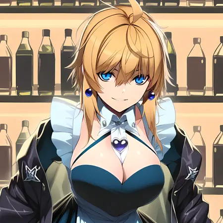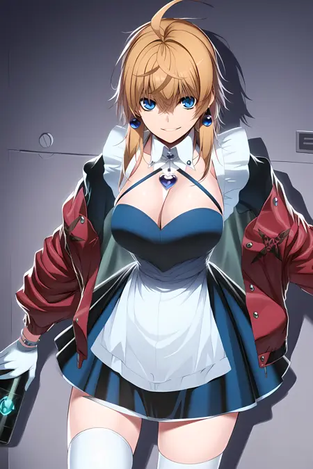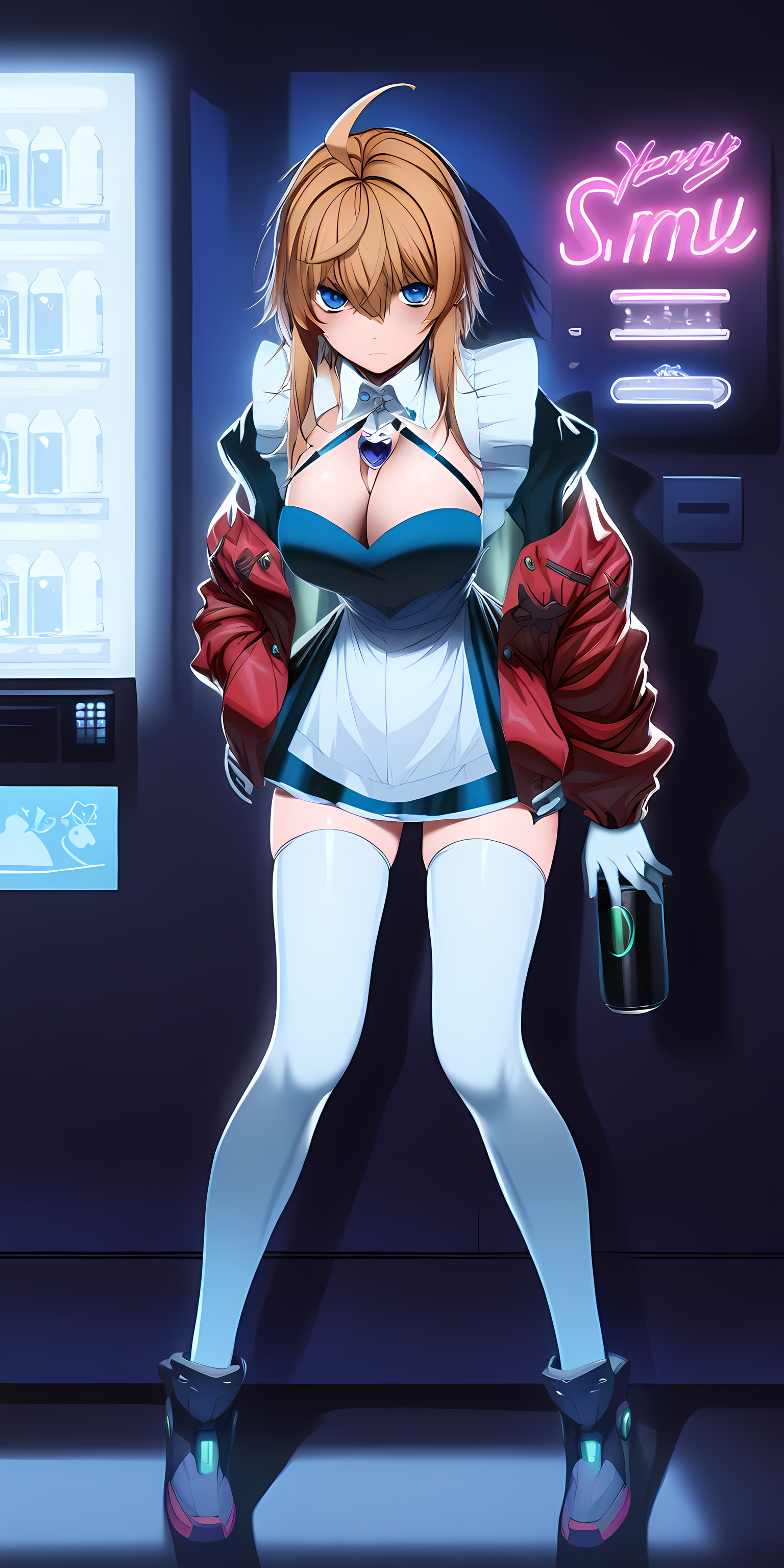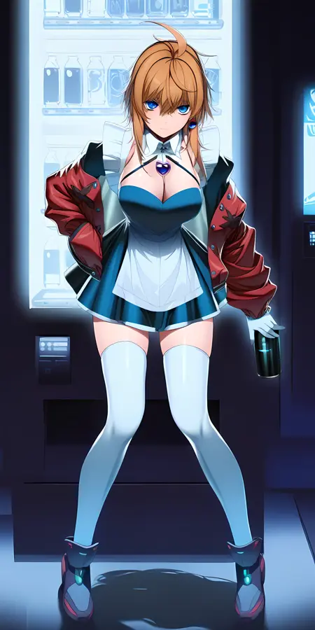 エイミー・ファーストウィングのメイド衣装は "amy_firstwing, 1girl, thighhighs, jacket, solo, gloves, cleavage, blue eyes, apron, red jacket, ahoge, dress, open jacket, white gloves, white thighhighs, off shoulder, large breasts, neon lights, open clothes, jewelry " です。