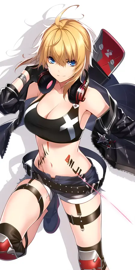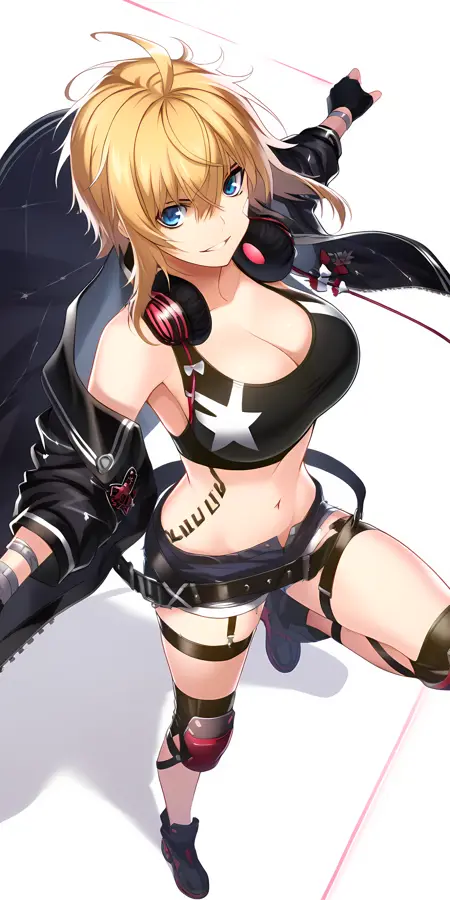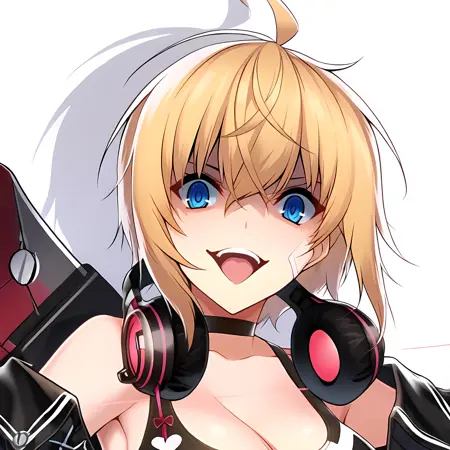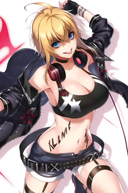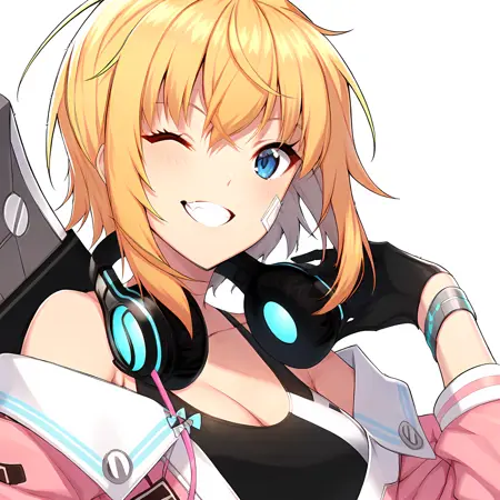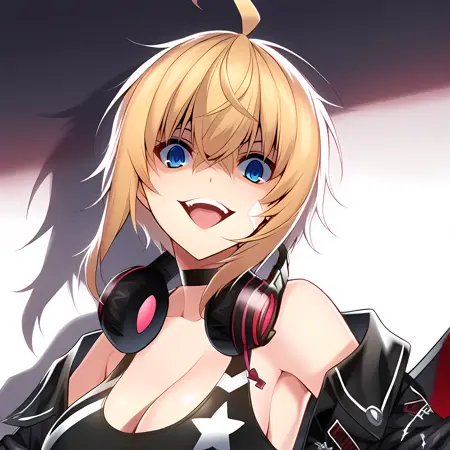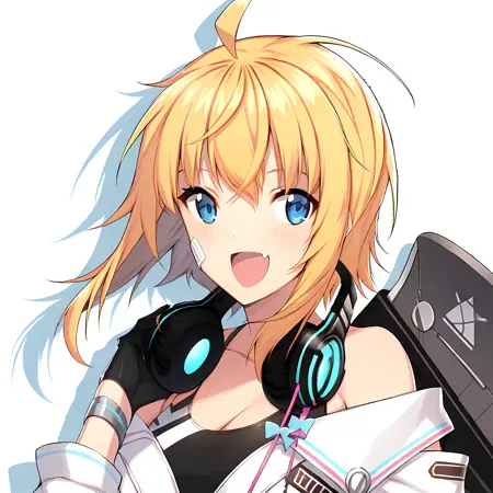 エイミー・ファーストウィングのアクティベーションタグは "amy_firstwing, 1girl, blue eyes, shorts, solo, gloves, jacket, blonde hair, navel, belt, ahoge, open clothes, black gloves, headphones, black jacket, knee pads, fingerless gloves, white background, smile, headphones around neck, open mouth, open jacket, cleavage, midriff, " です。