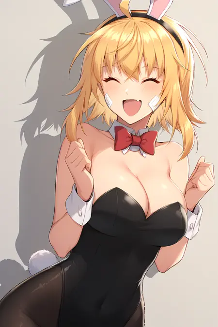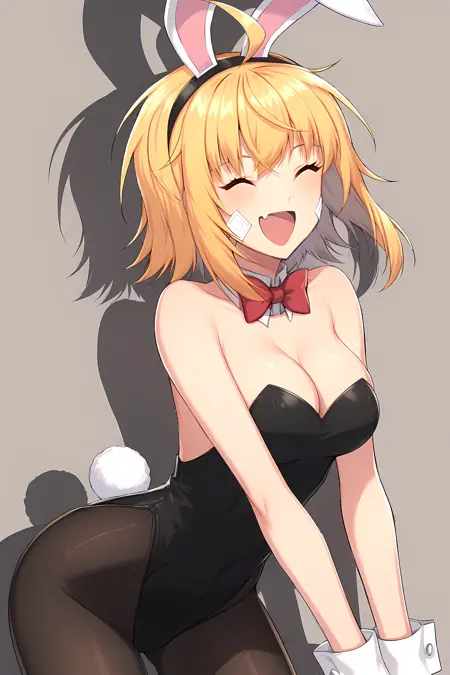 エイミー・ストリックランドのバニーガール衣装は "amy_strickland, 1girl, playboy bunny, rabbit ears, animal ears, blonde hair, solo, pantyhose, bow, detached collar, blue eyes, rabbit tail, fake animal ears, tail, black leotard, red bow, leotard, bowtie, wrist cuffs, cleavage, " です。
