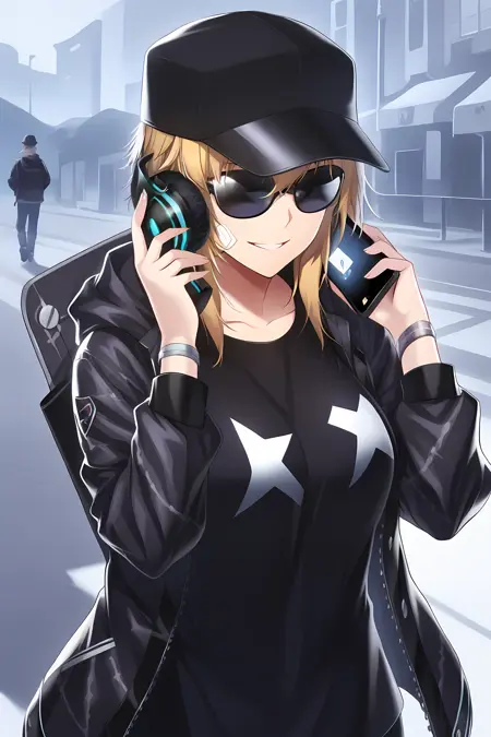 エイミー・ファーストウィングのスパイ衣装は "amy_firstwing, hat, phone, sunglasses, jacket, 1girl, black headwear, cellphone, shirt, black shirt, blonde hair, baseball cap, smile, open clothes, hood, black jacket, open jacket, collarbone, long sleeves, outdoors, solo focus, jeans " です。