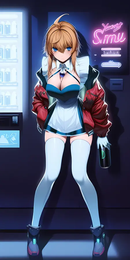 Amy Firstwing의 메이드 복장은 "amy_firstwing, 1girl, thighhighs, jacket, solo, gloves, cleavage, blue eyes, apron, red jacket, ahoge, dress, open jacket, white gloves, white thighhighs, off shoulder, large breasts, neon lights, open clothes, jewelry"입니다.