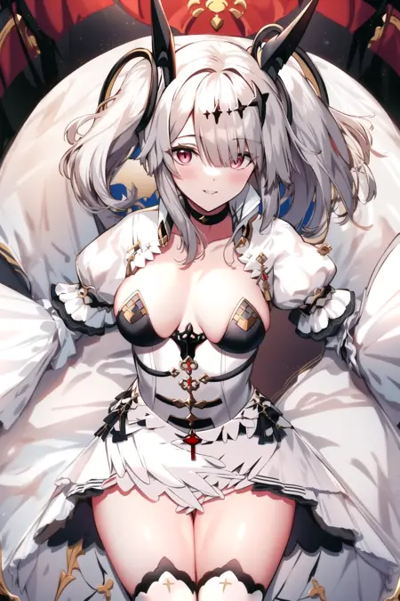 예시 프롬프트: 초커, 긴 소매, 장갑, 검은 장갑, 흰 드레스, 손가락 없는 장갑, 검은 초커, 드레스, 줄리엣 소매, 허벅지, 불룩한 소매, 허벅지 길이 양말, 날개