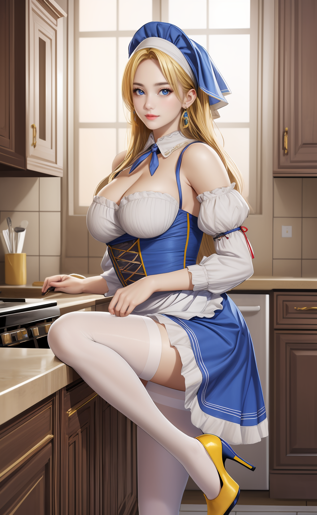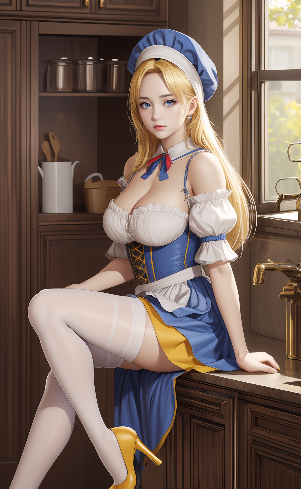 blue headwear,dress,blue dress,cleavage,detached sleeves,bare shoulders,apron,jewelry,corset,skirt,white thighhighs,pantyhose,yellow footwear,high heels