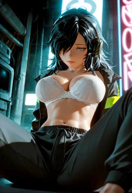 jacket, open clothes, open jacket, bra, white bra, lace-trimmed bra, midriff, pants, sweatpants, headphones,