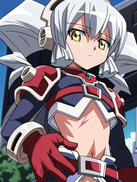 armor, blue shirt, blue skirt, chest belt, center opening, midriff, red gloves, wrist cuffs, panties드레스:
