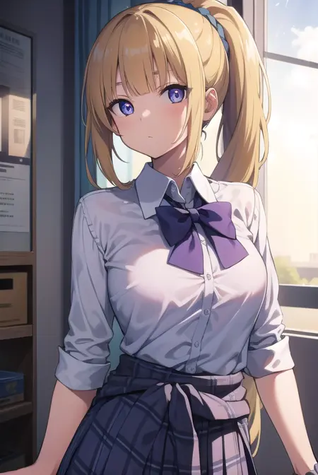 Appearance: kei karuizawa, long hair, bangs, blunt bangs, (purple eyes:1.1), blonde hair, shirt, hair ornament, ponytail, scrunchie, blue scrunchie,