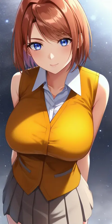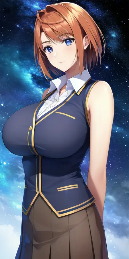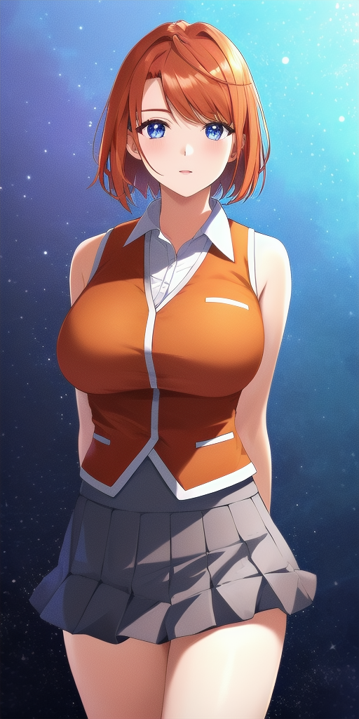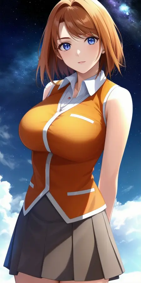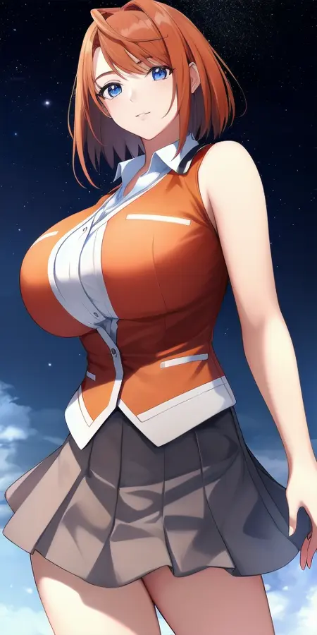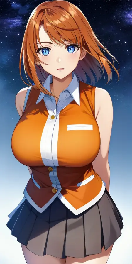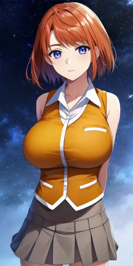 • white_sleeveless_collared_shirt_orange_vest_grey_skirt:她的原始服装。