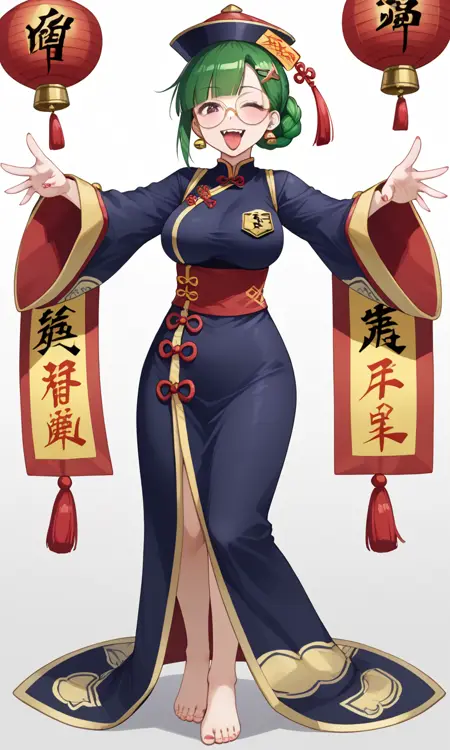 Momomori momo, glasses, braid, round eyewear, green hair, long hair, hairband, blush, blunt bangs