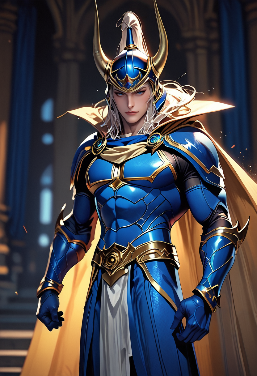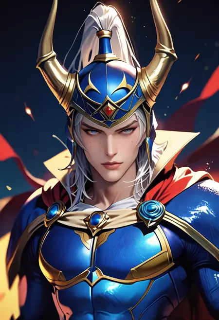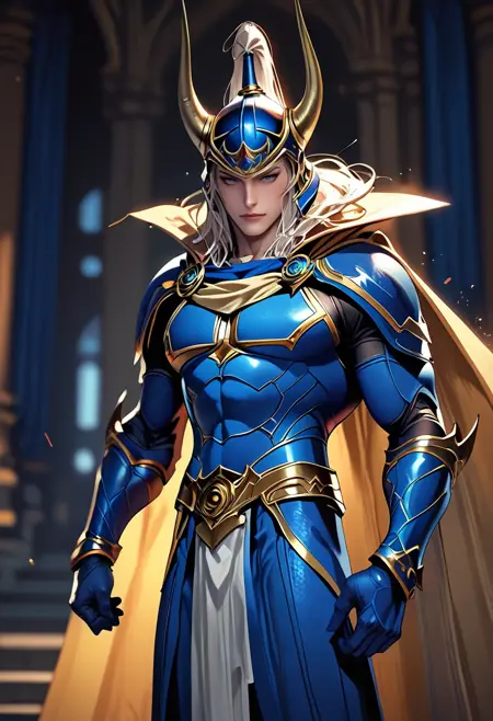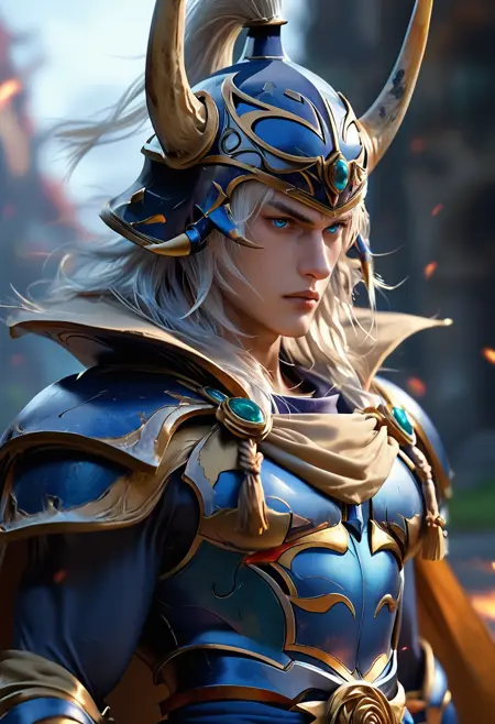woflb_ff, 蓝色盔甲,角盔,披风,上半身