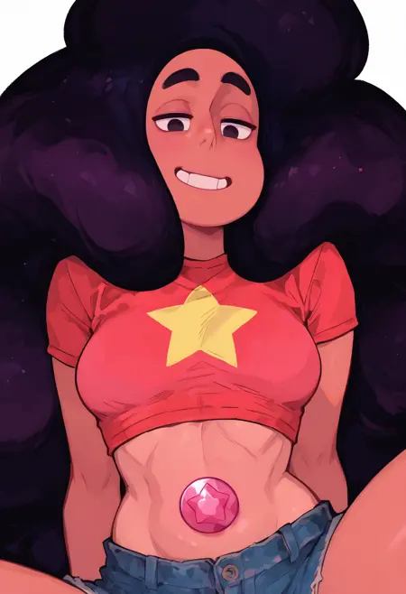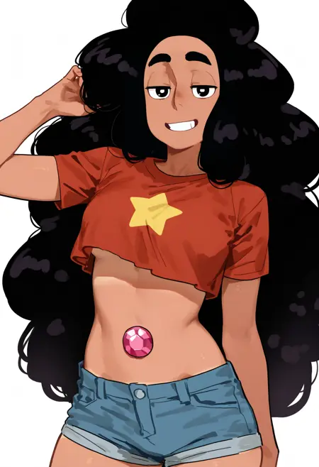 トリガー語と登場回数: stevonnie (steven universe), 1girl, tan, long hair, black hair, black eyes, thick eyebrows, big hair, pink stomach jewel