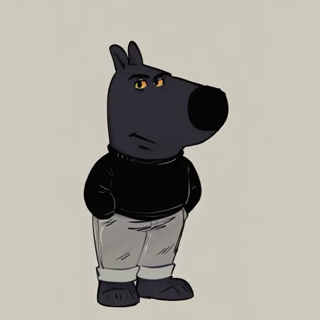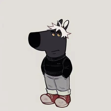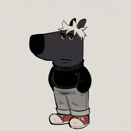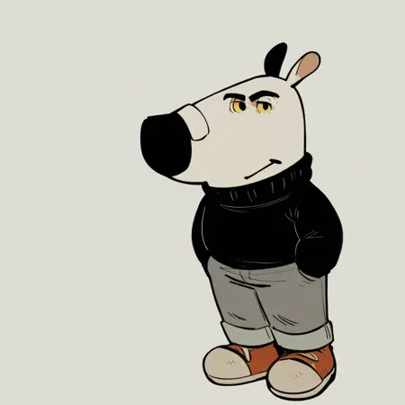 mikus-concept, hands hidden in pockets, big black nose, expressive eyes, standing