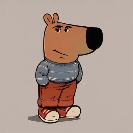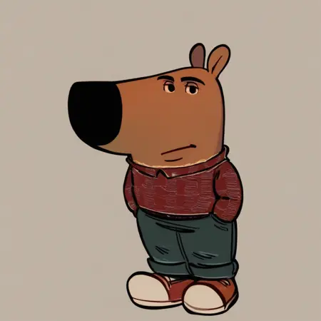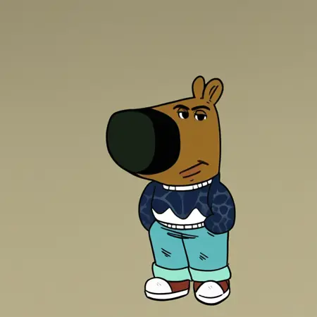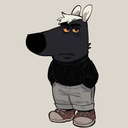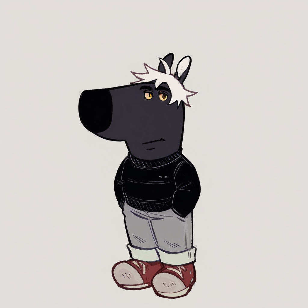 mikus-concept, hands hidden in pockets, big black nose, expressive eyes, standing