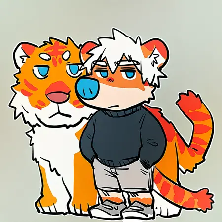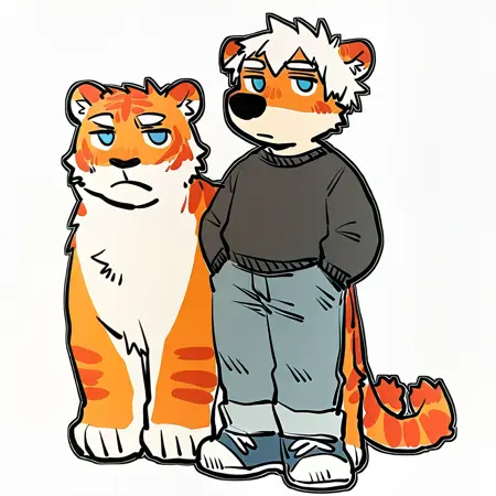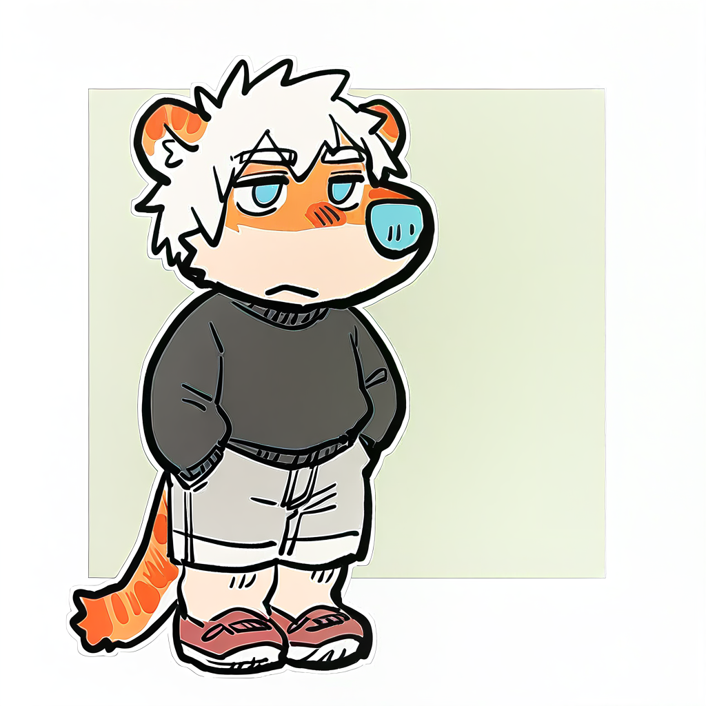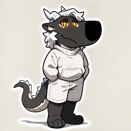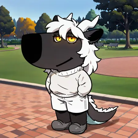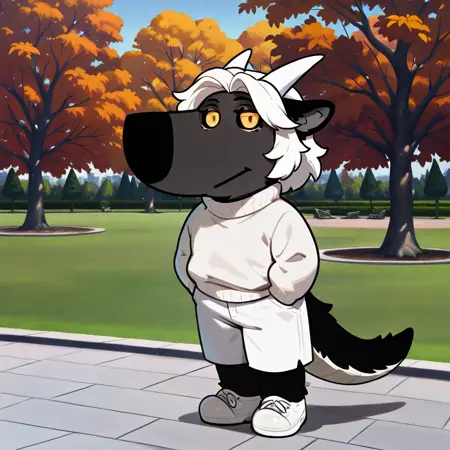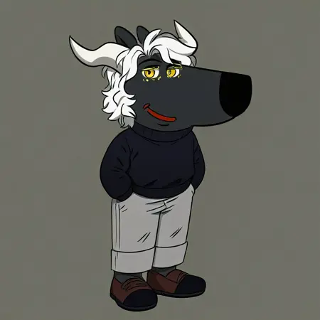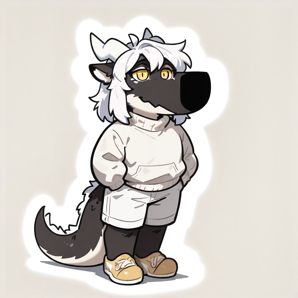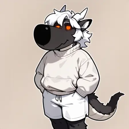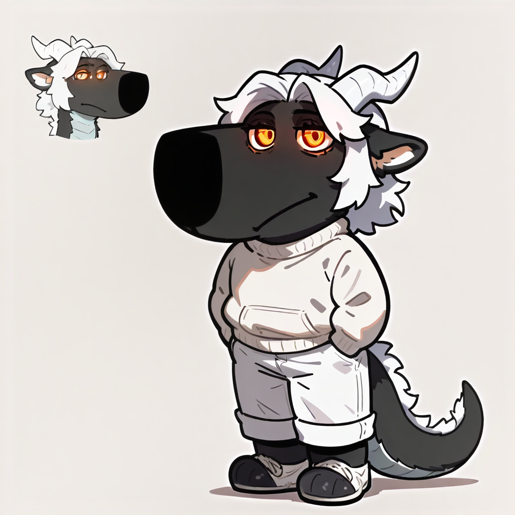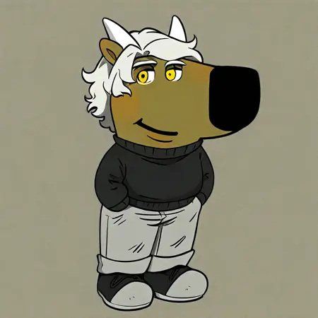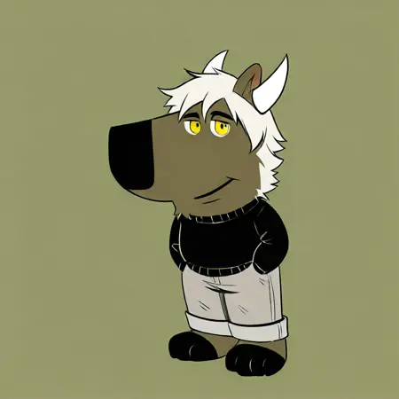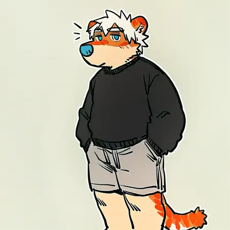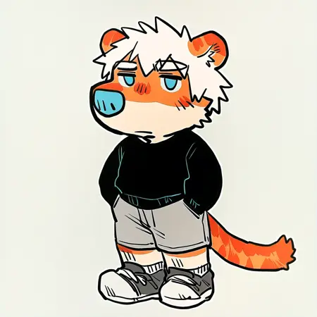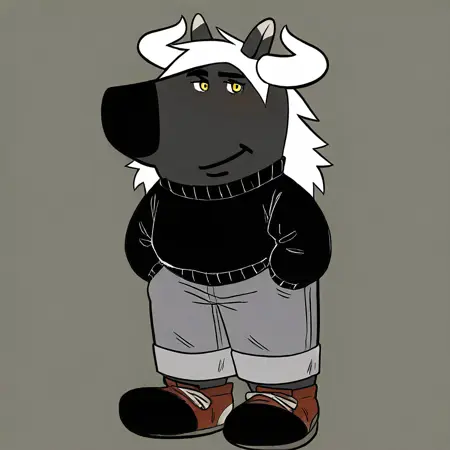 mikus-concept, hands hidden in pockets, big black nose, expressive eyes, standing