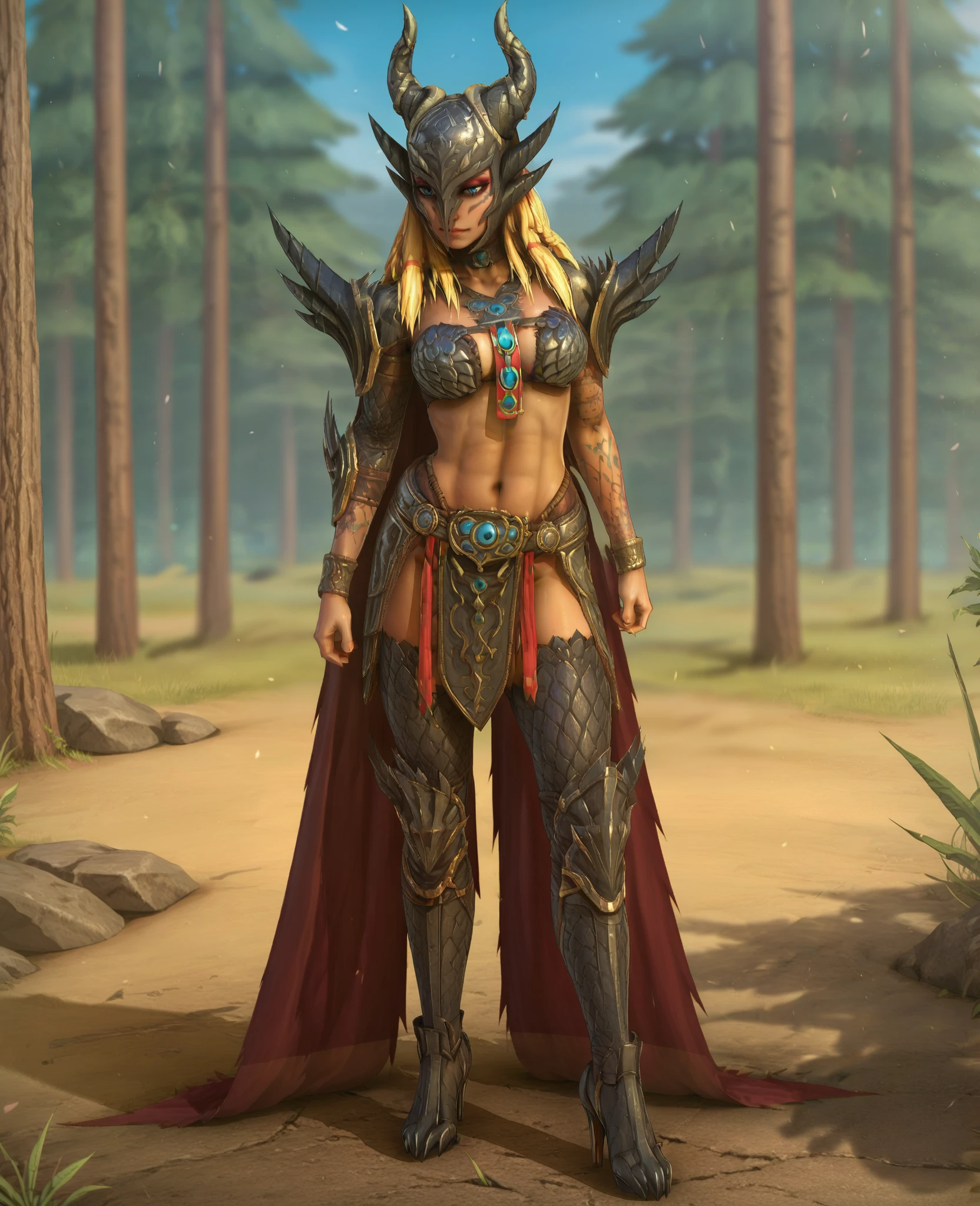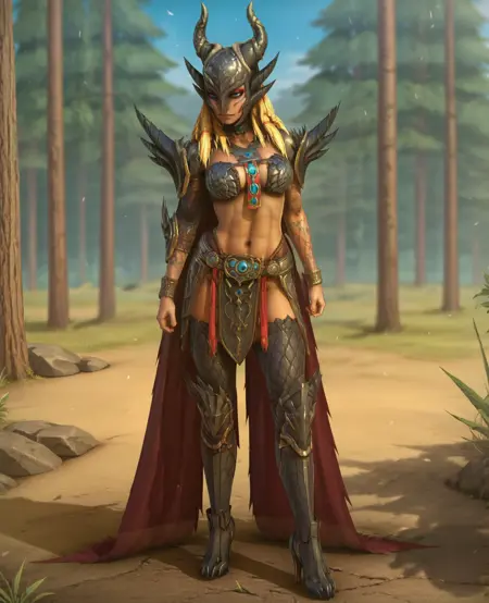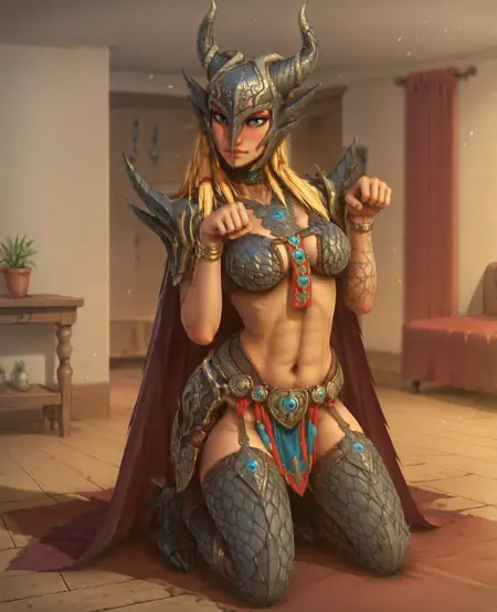 服装: 比基尼盔甲、斗篷、头盔、肩甲、角、过膝长靴、单臂甲、单只手套、手镯