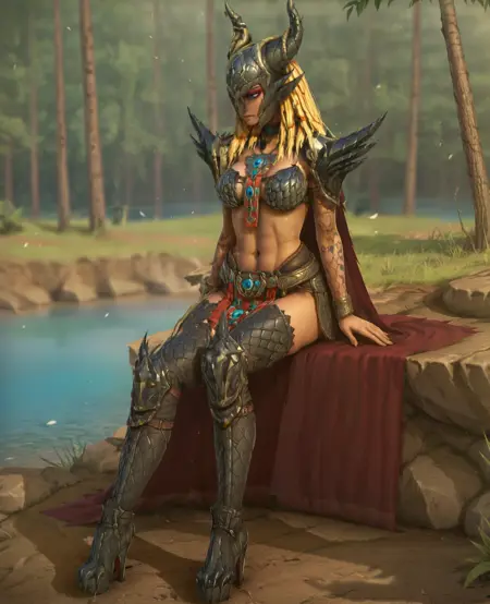 触发词: ScylRSL, 1girl, 金发, 长发, 蓝眼, 红色眼影, 手臂纹身