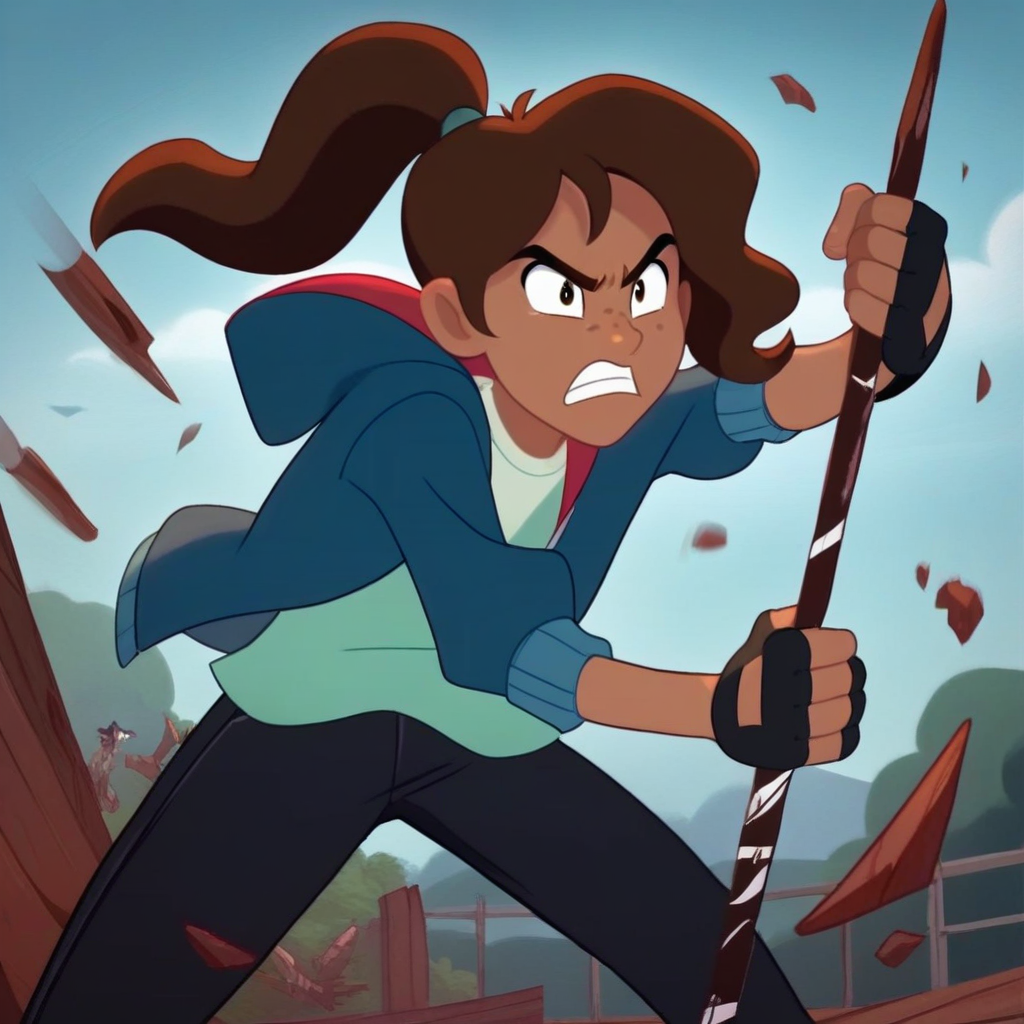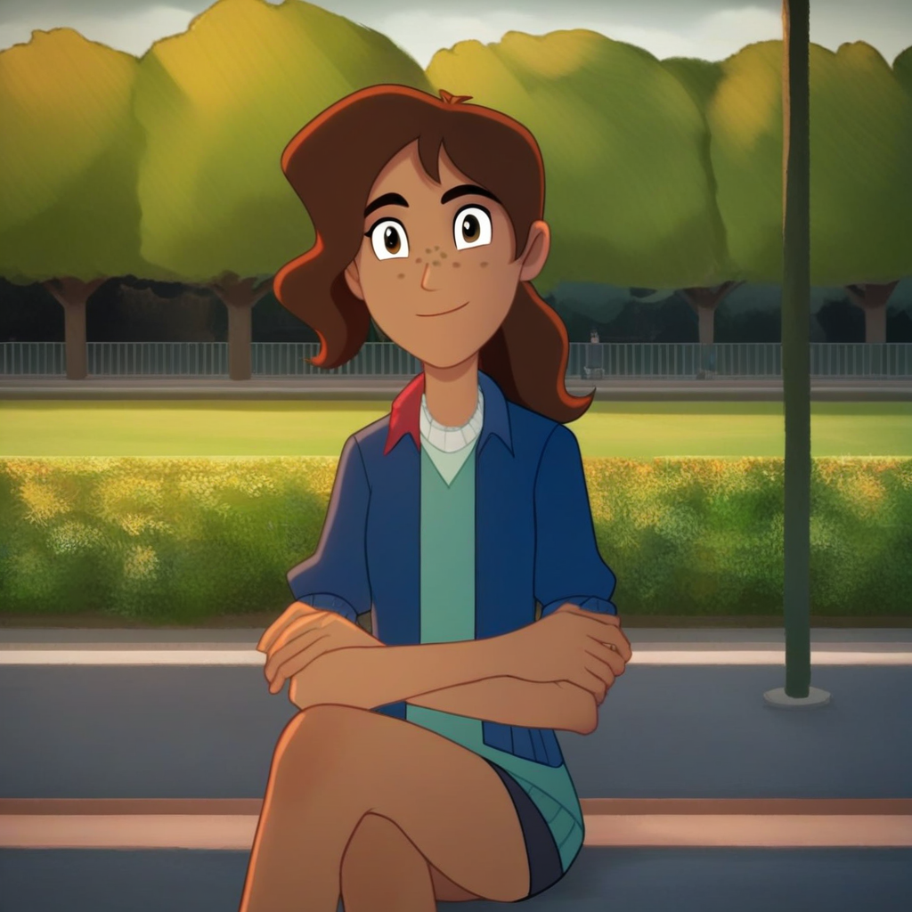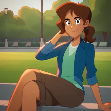 밝은 갈색 피부, 물결치는 어두운 갈색 머리, 토끼 꼬리, 얼굴에 두더지, 갈색 눈