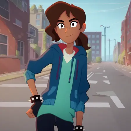 흰색 속옷, 밝은 푸른색 셔츠, 어두운 파란색 후디, 검은 청바지, 손가락 없는 장갑, 날카로운 팔찌, 티올 트레인러
