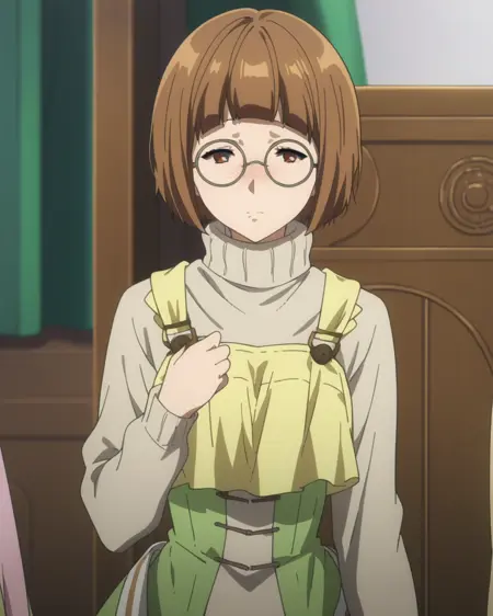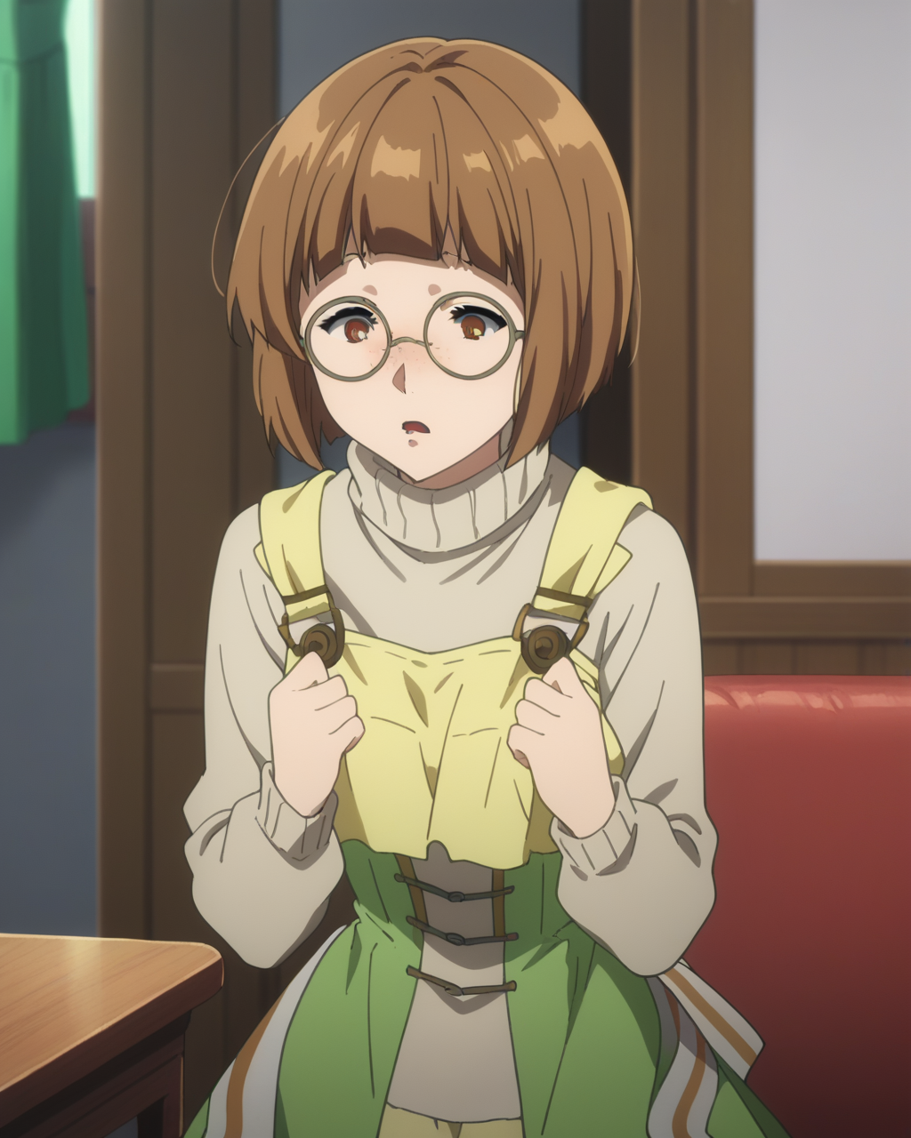 - 1girl, solo, ericabrown, brown eyes, brown hair, short hair, bob cut, bangs, freckles, glasses, round eyewear,