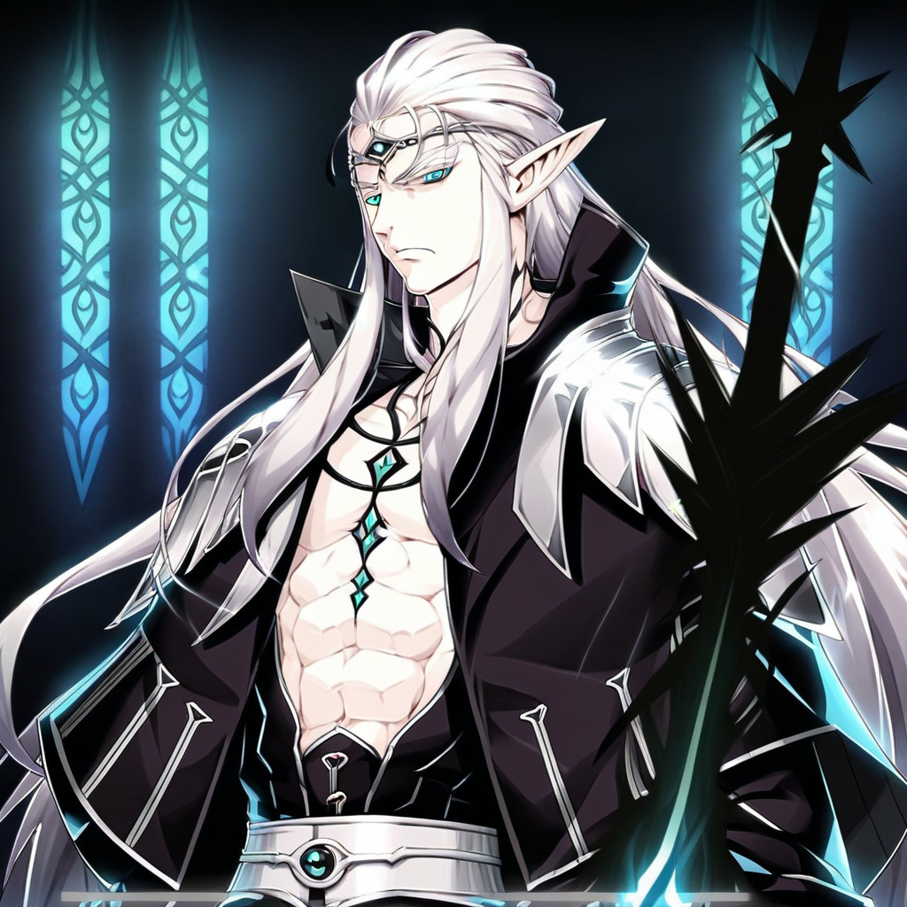 触发词:brieg,苍白的皮肤,长发,白发,尖耳,精灵,黑色衣物配银色装饰,敞开的衬衫,腹肌,胸肌,高领,头环