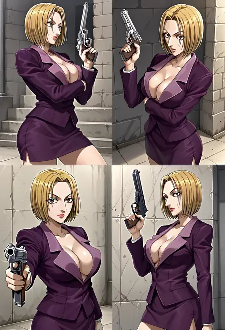 帕库诺达_Def,短发,金发,棕眼,夹克,紫色夹克,露乳,大胸部,裙子,超短裙,铅笔裙,