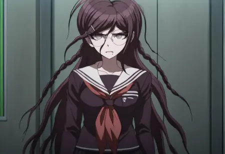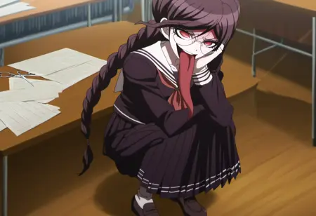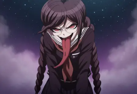 Ultra Despair Girls衣装(ジェノサイド・ジャック): 一貫性に欠ける傾向がありますが、試す場合は「Genocider Sho wearing her uniform from Danganronpa Another Episode. She has her tongue sticking out and has an evil look in her eyes. She is wearing glasses and a purple and white sailor collar uniform with a red neck bow. She has dark purple hair in two braids.」と記述してください。プロンプトを微調整すれば、より良い結果が出る可能性があります。