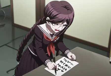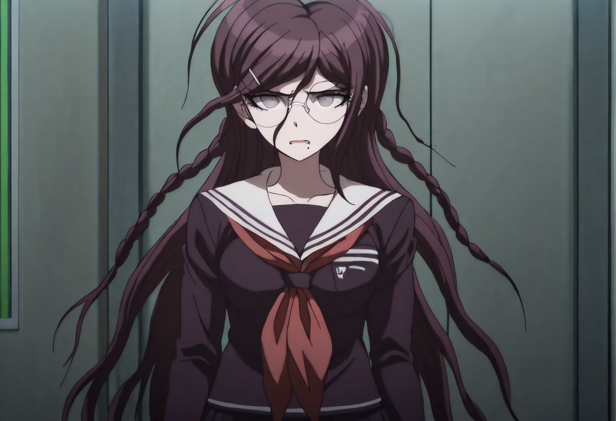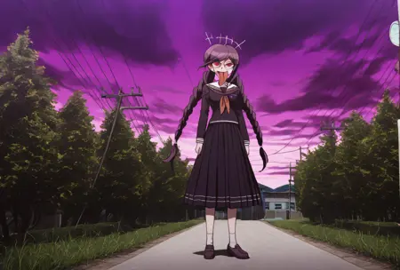울트라 디스페어 걸스 복장 (제노사이드 잭): 이 옷은 일관성이 낮지만 시도해보고 싶다면 "Genocider Sho wearing her uniform from Danganronpa Another Episode. She has her tongue sticking out and has an evil look in her eyes. She is wearing glasses and a purple and white sailor collar uniform with a red neck bow. She has dark purple hair in two braids."를 사용하세요. 프롬프트를 조정하면 더 나은 결과를 유도할 수 있습니다.