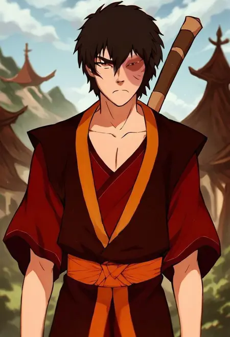 Zuko, yellow eyes, ruffled black hair, red burned scar on left eye