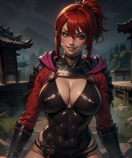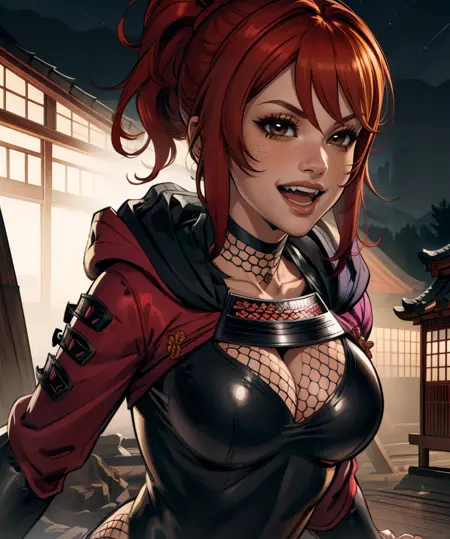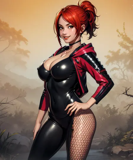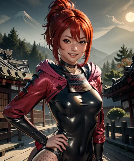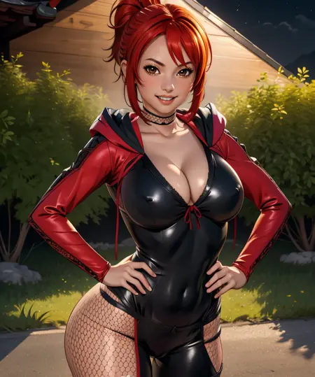 타이트한 검은 바디수트 또는 바디수트, 손가락 없는 장갑, 피시넷, 쿠나이 끈,