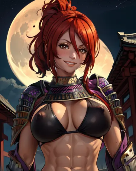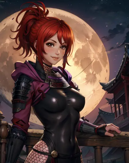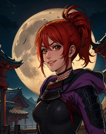 Mitsuki, red hair, brown eyes, --- ponytail, bangs,