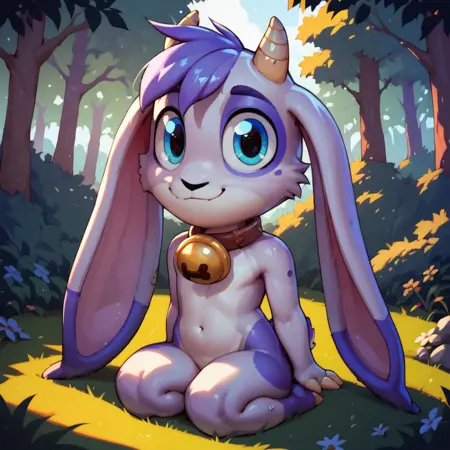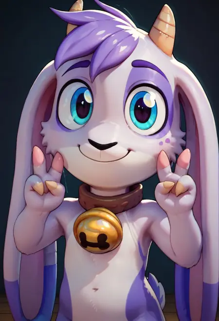 B1LL13、アントロのヤギ、紫色の髪、多色の体、非常に長い耳、角、茶色の首輪、金の鈴、3本指、青い目、短い尾、目の模様、割れ蹄