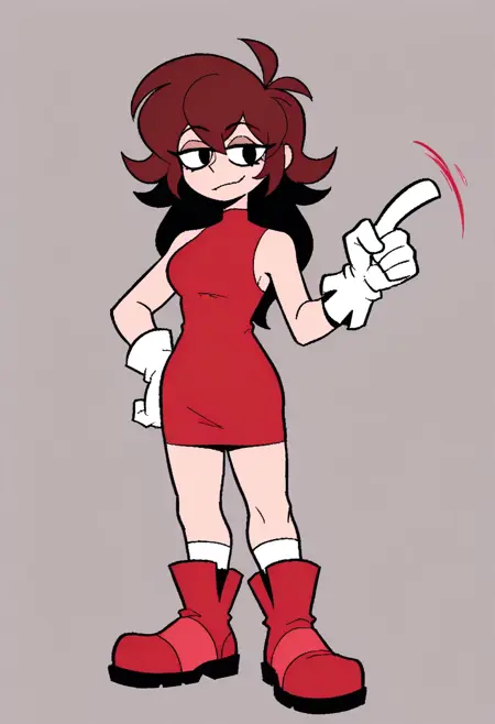 NeedlemouseGFEXE, 1girl, taller, thinner body, black eyes, brown-red hair, less, red sleevless dress, white gloves, medium black socks, red boots, fair skin
